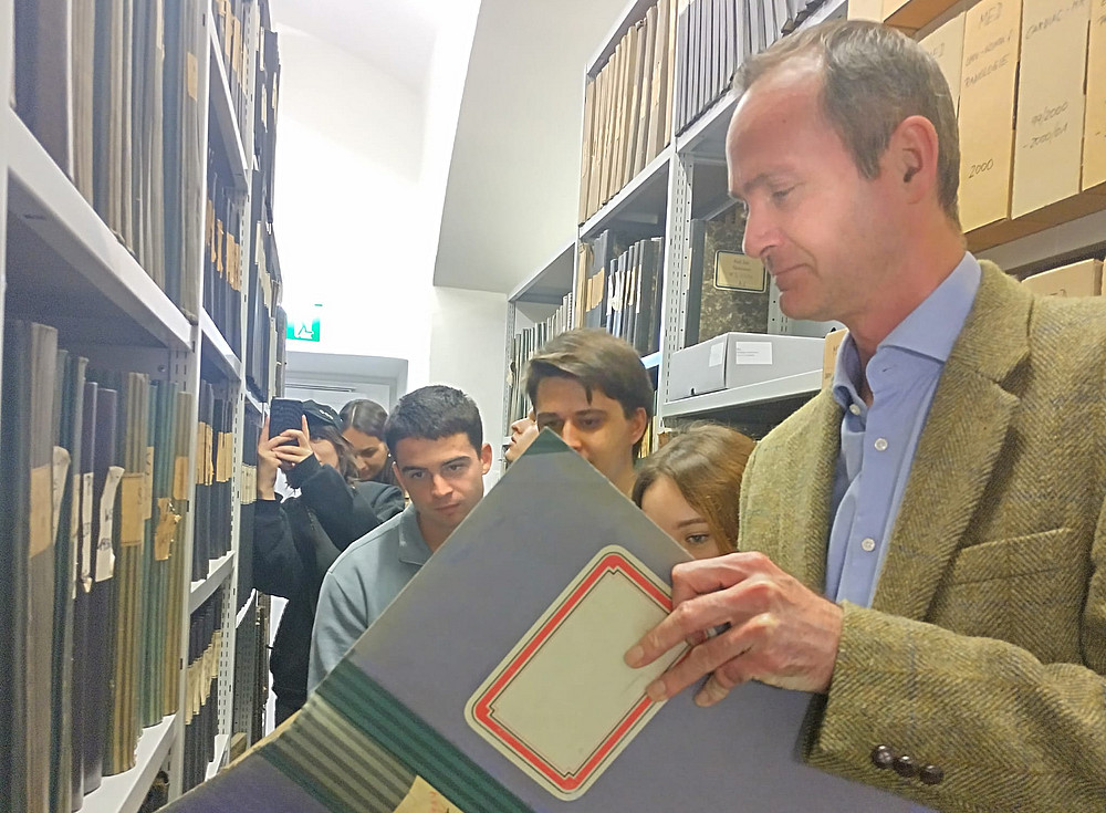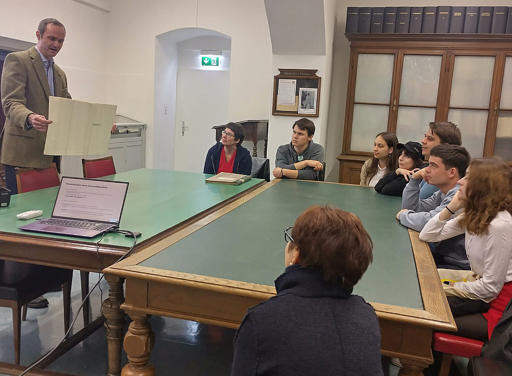 In einer kurzen Präsentation wurden die Aufgaben und die Bestände skizziert. Ein Eingangsprotokoll der Philosophischen Fakultät aus den 1920er Jahren, Objekte wie die Totenmaske Alexander Rolletts (1903) oder auch Pläne für den Bau des Grazer Landeskrankenhauses vom Beginn des 20. Jahrhunderts konnten von den äußerst interessierten Studierenden in Augenschein genommen werden. Zudem wurde ein Rundgang durch die Depots unternommen. In der Vitrine der Bibliothek lag schließlich das erste Promotionsbuch der Universität (1586–1681) aufgeschlagen bereit, um auf die bekannteste Verbindung zwischen der Universität Graz und der Slowakei hinzuweisen: Péter Pázmány (1570–1637), dem beim Antritt seiner Professur 1597 formal der höchste philosophische Grad der Grazer Universität, damals das Magisterium, verliehen wurde, spielte eine besondere Rolle in dieser Hinsicht. Dieser aus Rumänien gebürtige Jesuit stieg zu den höchsten kirchlichen Würden auf, wurde als Fürstprimas 1616 schließlich zum geistlichen Oberhaupt des historischen Königreichs Ungarn, zu dem auch die heutige Slowakei gehörte. In Tyrnau (heute Trnava) im Westen der Slowakei gründete er 1635 eine Universität nach Grazer Vorbild, die 1777 nach Budapest verlegt wurde und noch heute als die renommierte Eötvös-Loránd-Universität besteht. Einmal mehr ist dies ein Beispiel für die historischen internationalen Vernetzungen, die das Universitätsarchiv seinen Gästen ins Gedächtnis ruft.